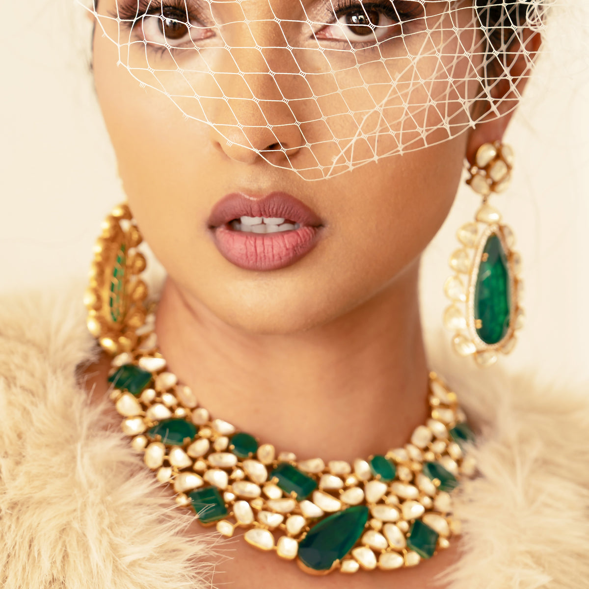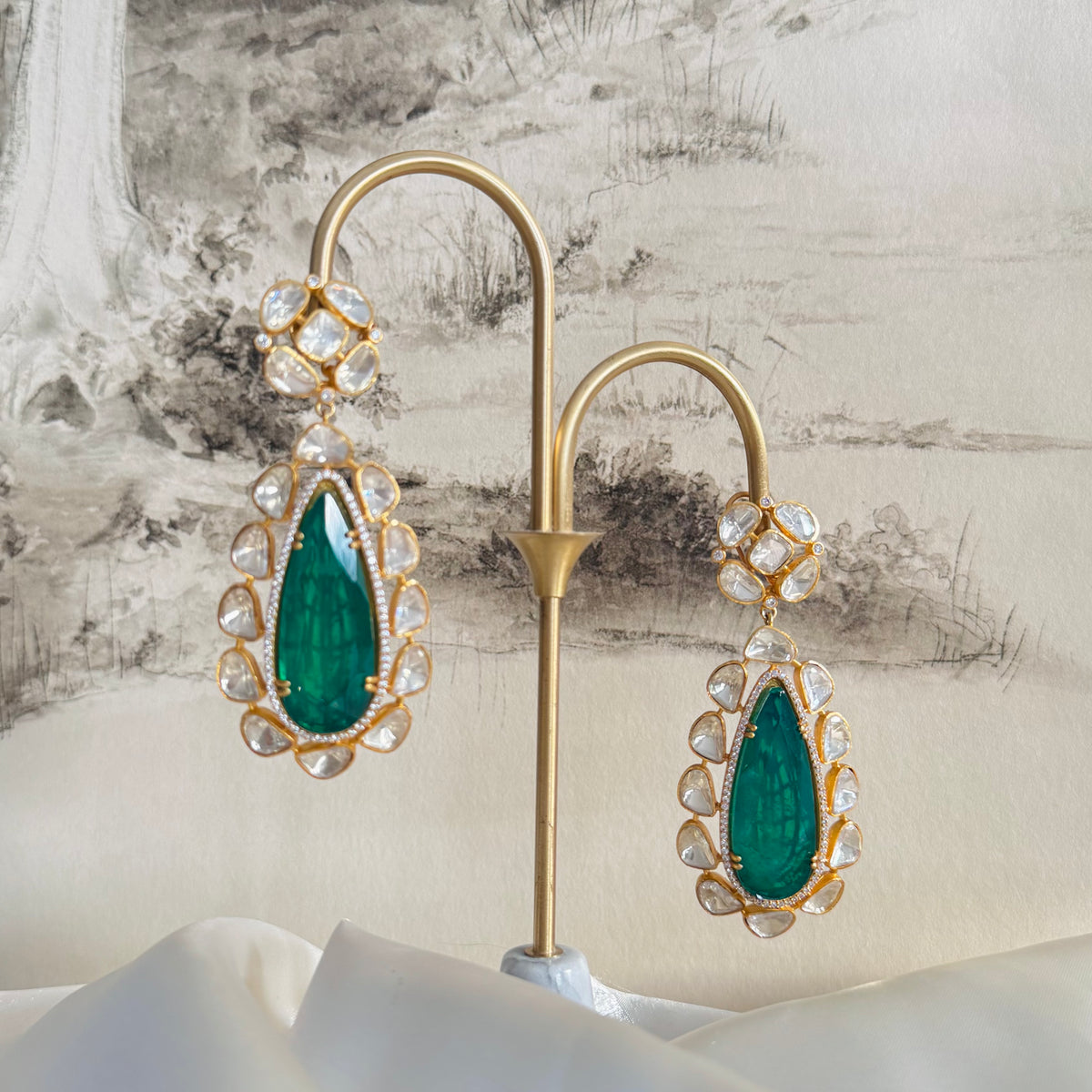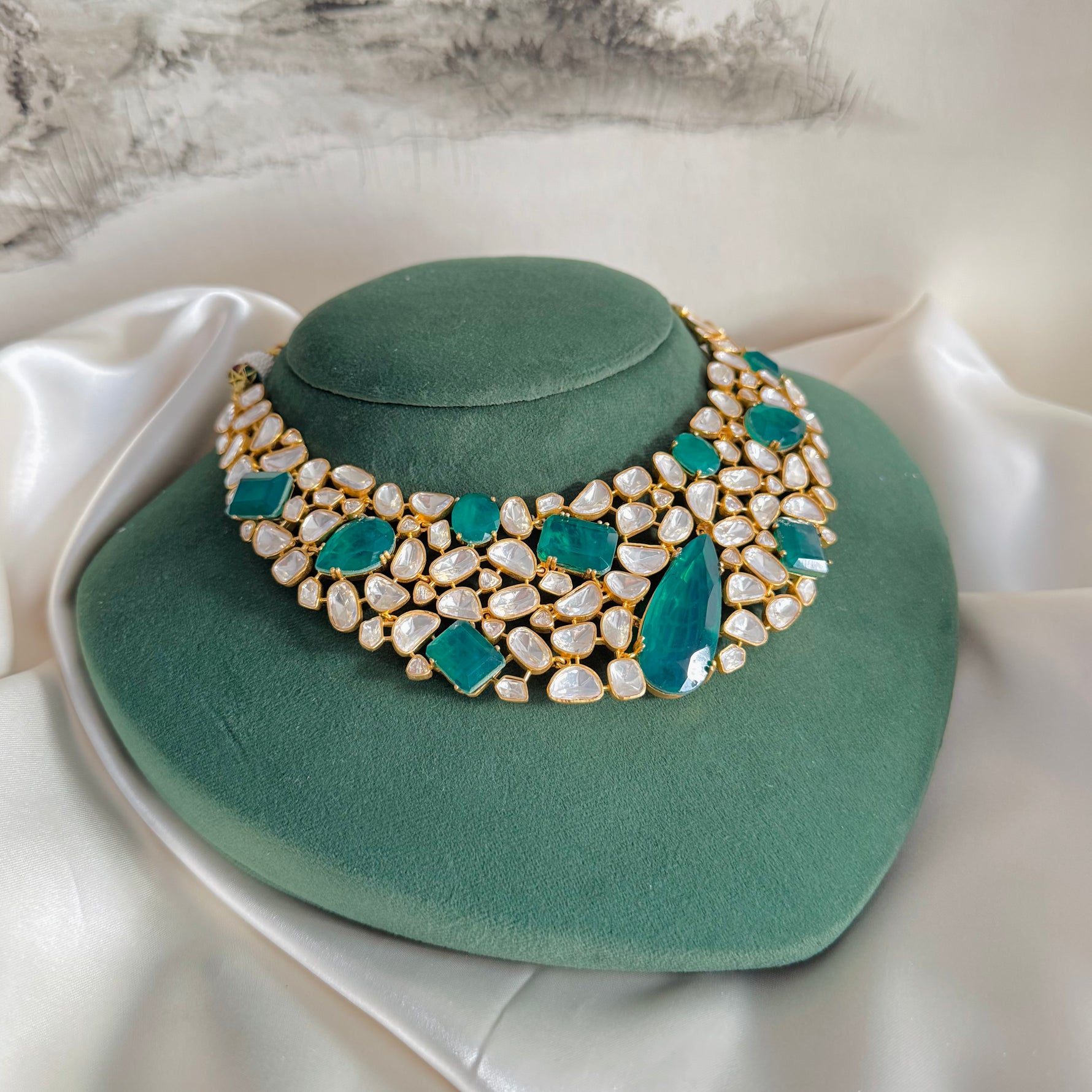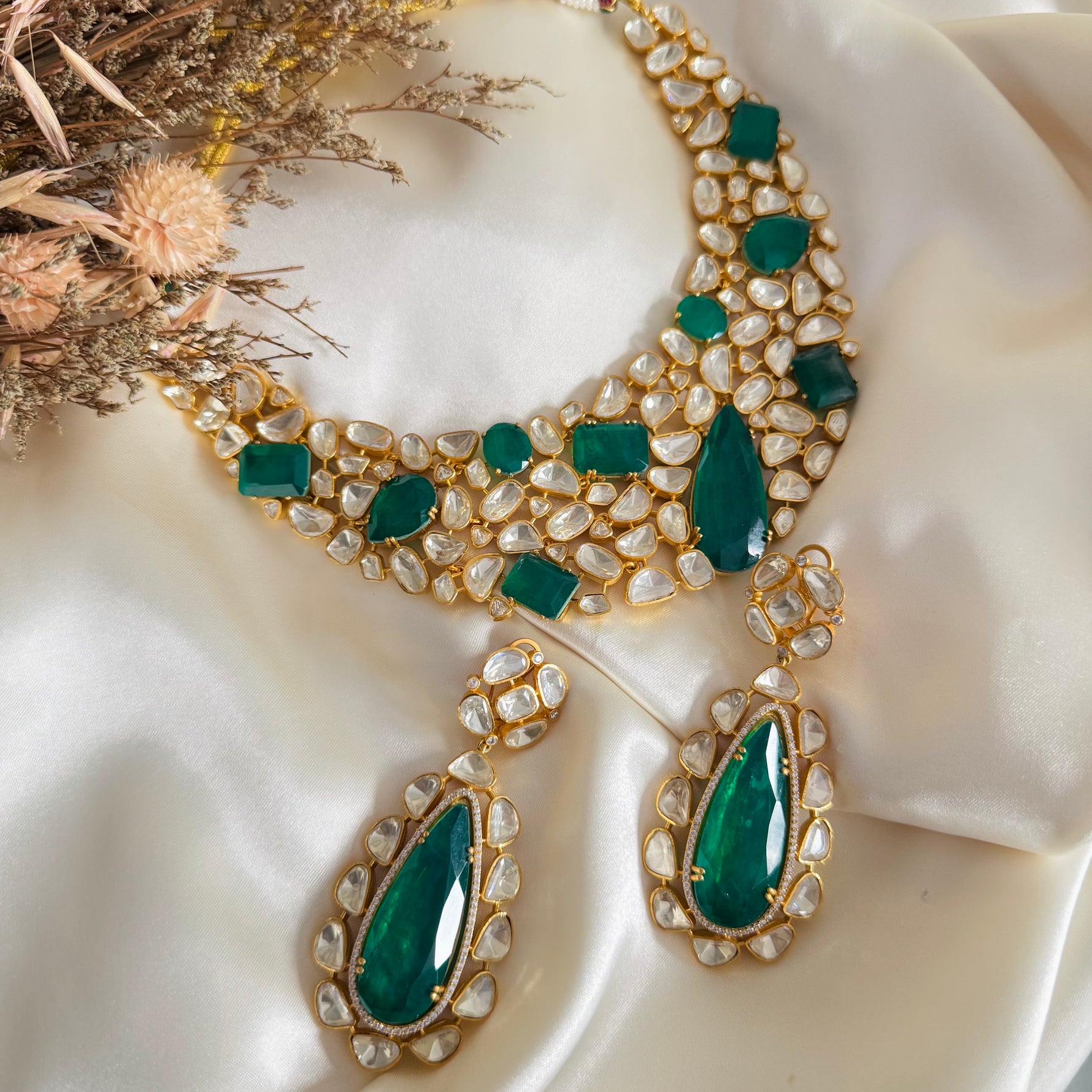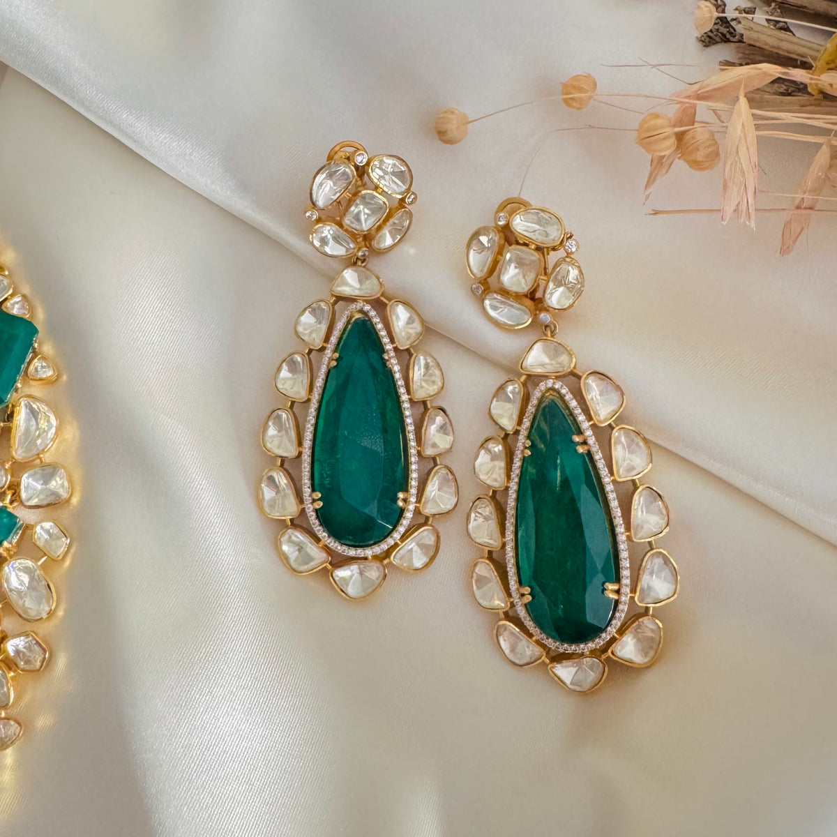 • Glass Moissanite Polki, semi-precious stones, 92.5 silver and gold plated.