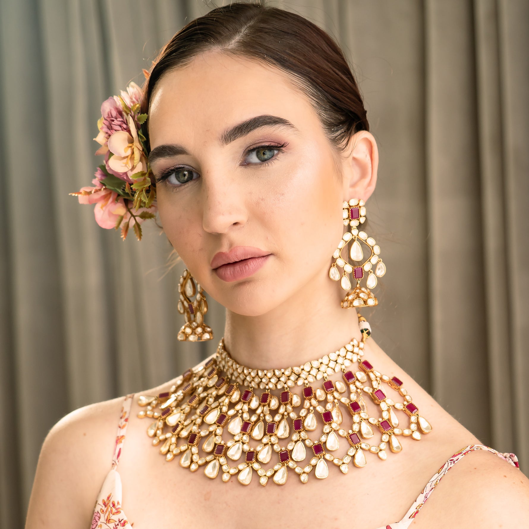 • Glass Moissanite Polki, semi-precious stones, 92.5 silver and gold plated.