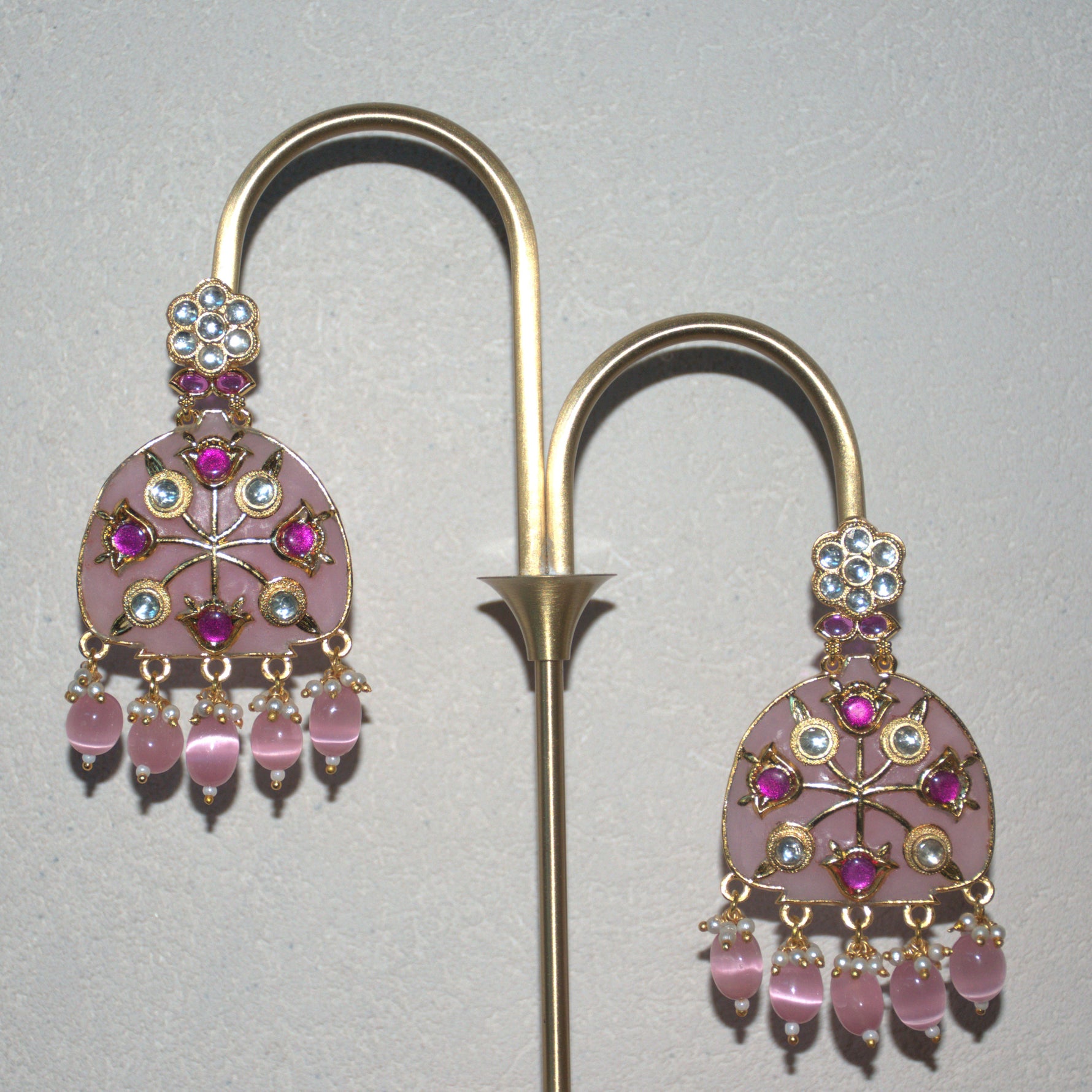 - Carved stone, meenakari work, kundan and gold-plated.