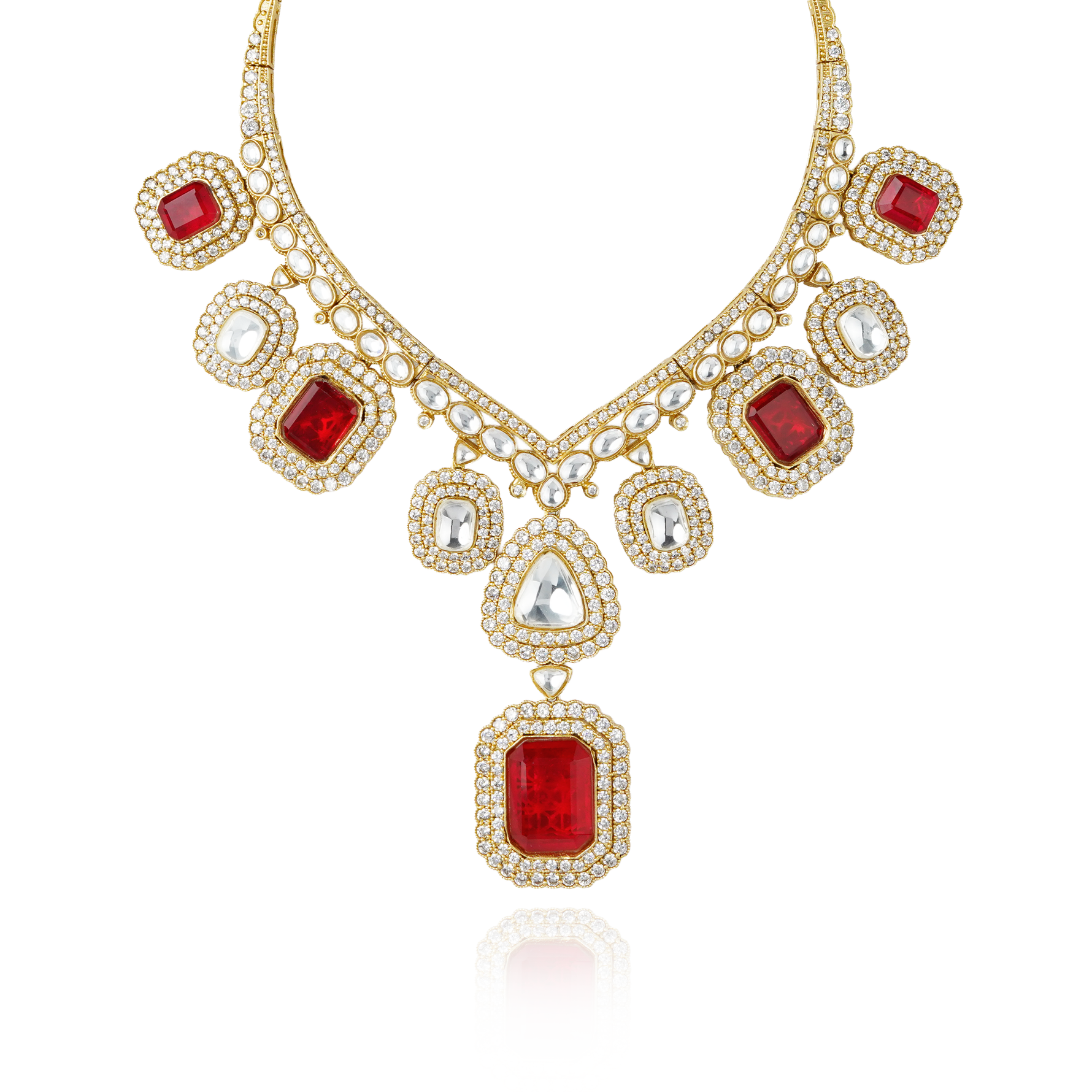 - Artificial kundan, american diamond, semi-precious stones and gold-plated.