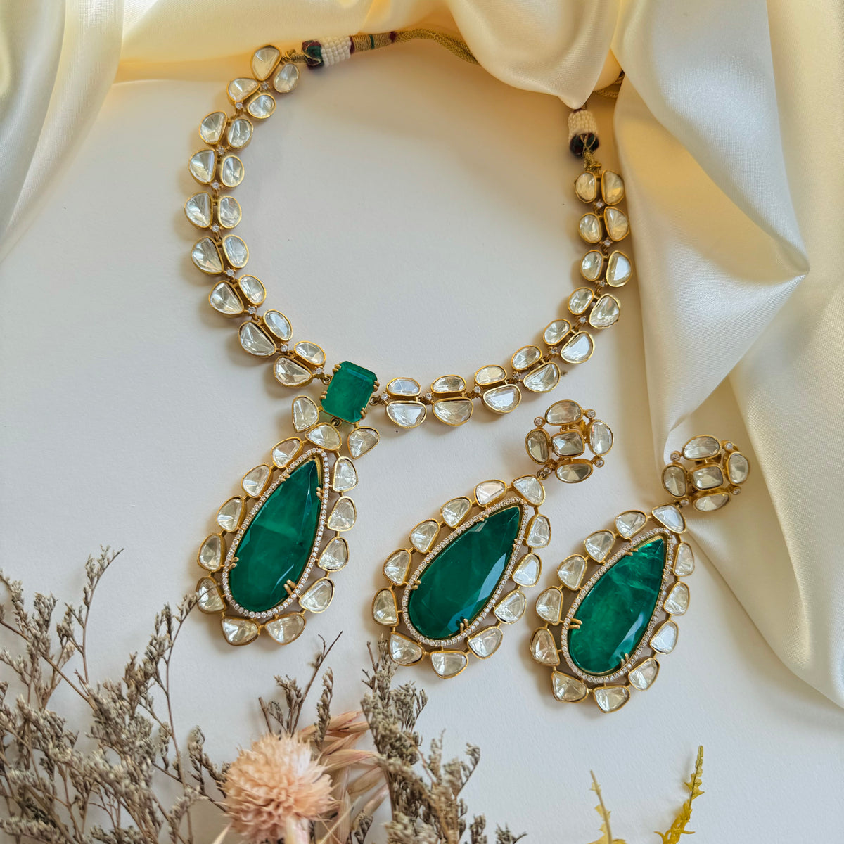 • Glass Moissanite Polki, semi precious stones, 92.5 silver and gold plated.
