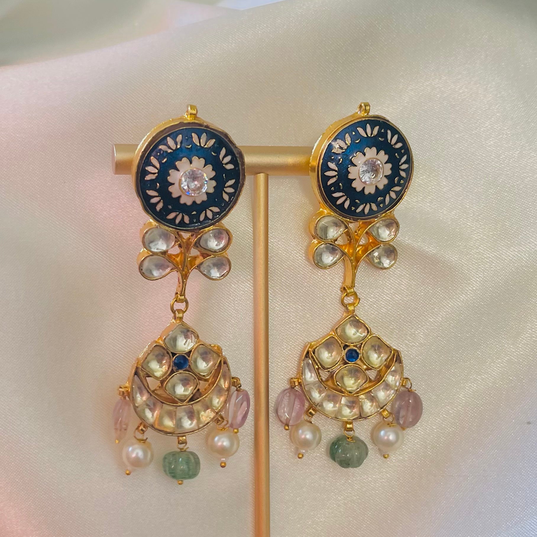 - Paachi kundan, meenakari work, faux beads and gold-plated.