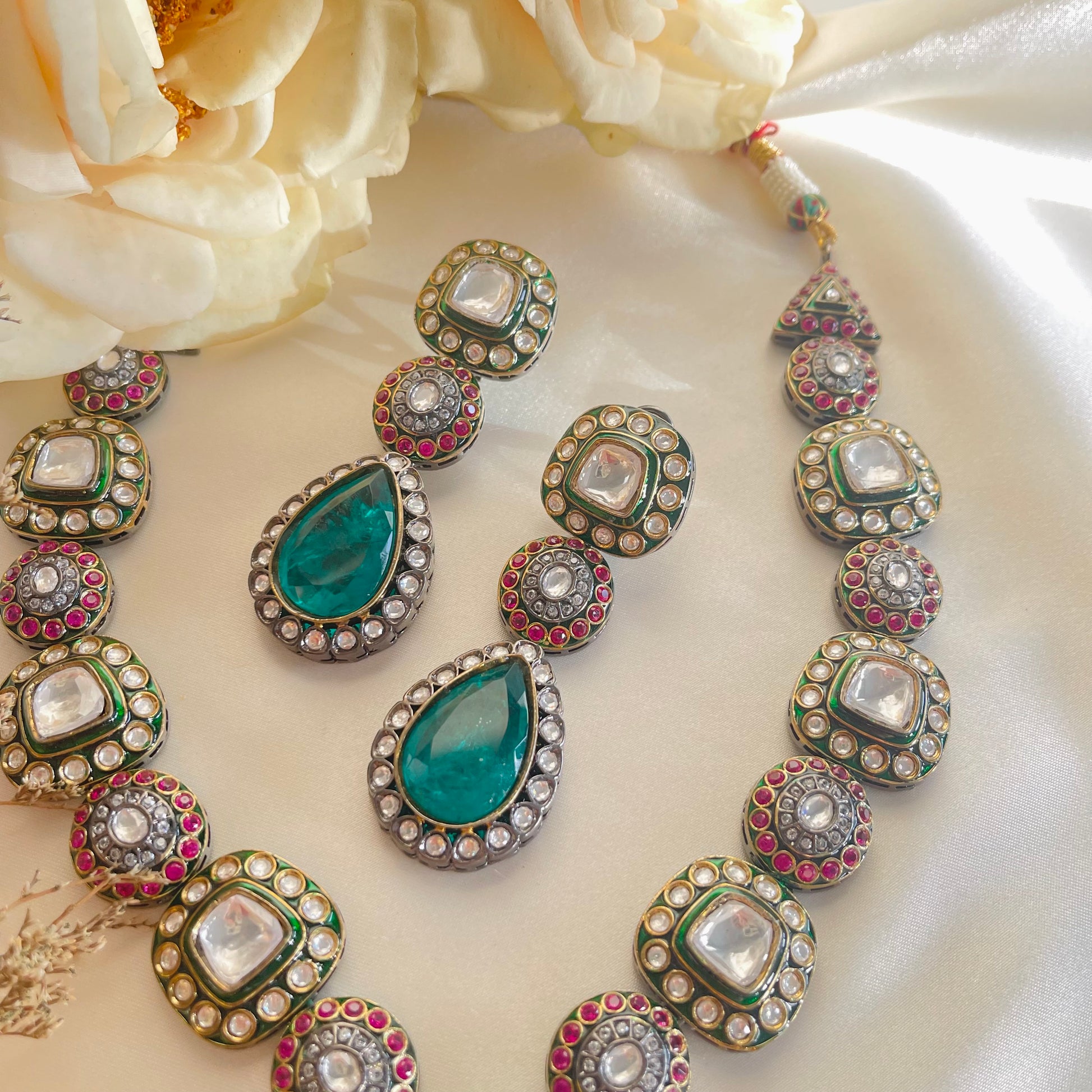 - German silver, artificial kundan, faux beads, silver finish and oxidized