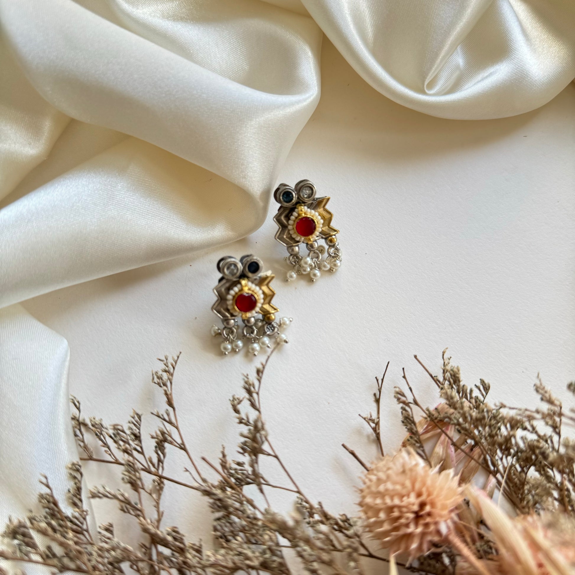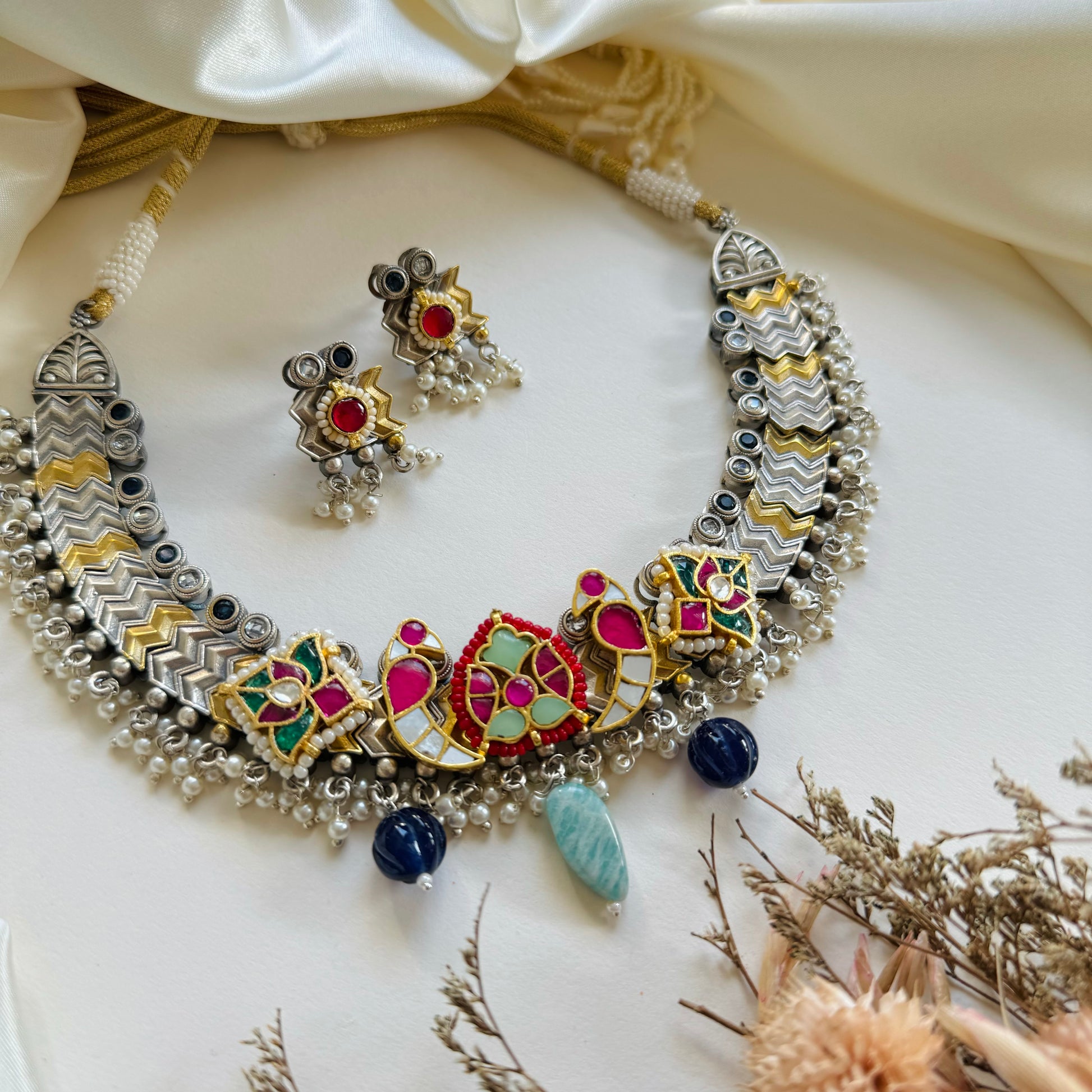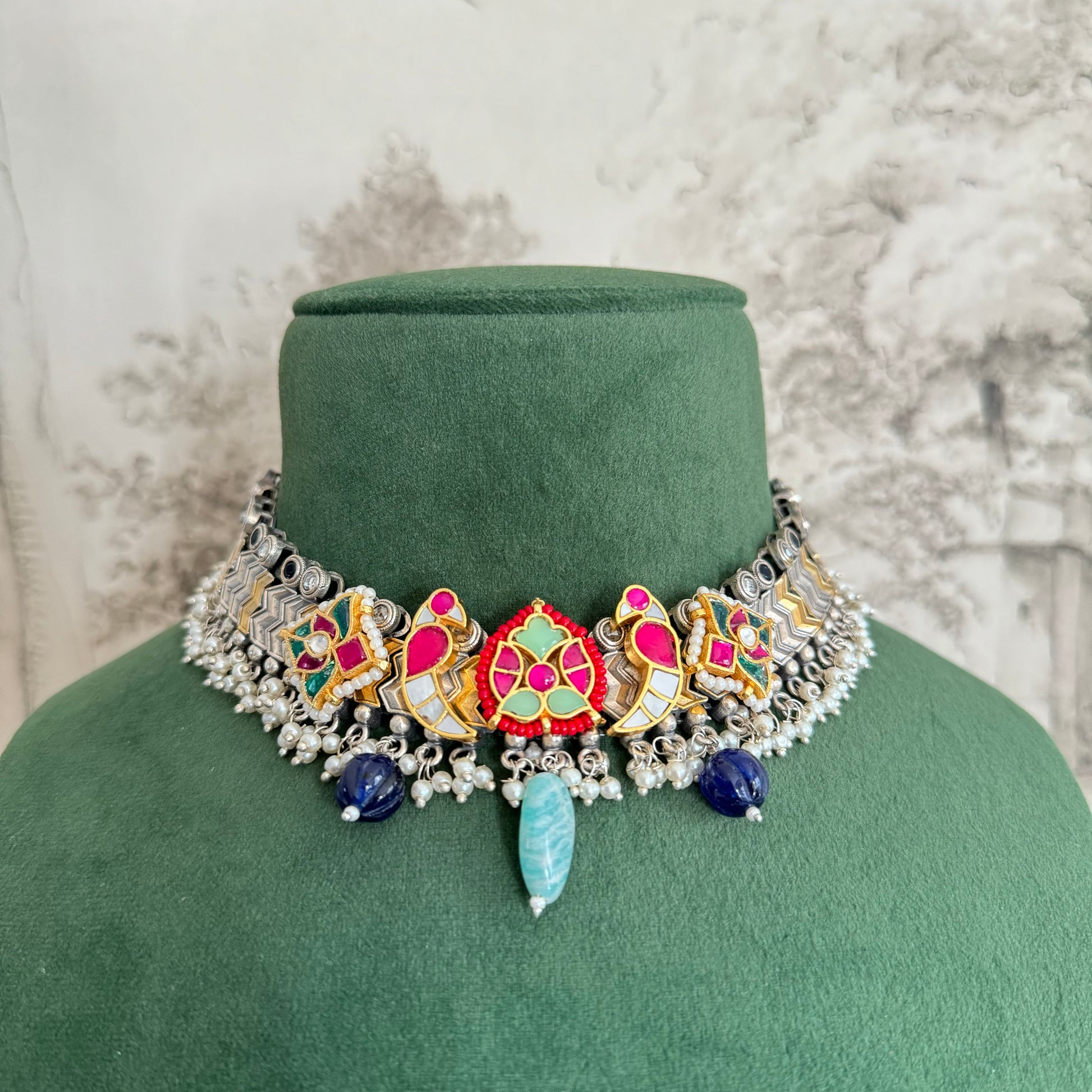 - Paachi kundan and silver finish.