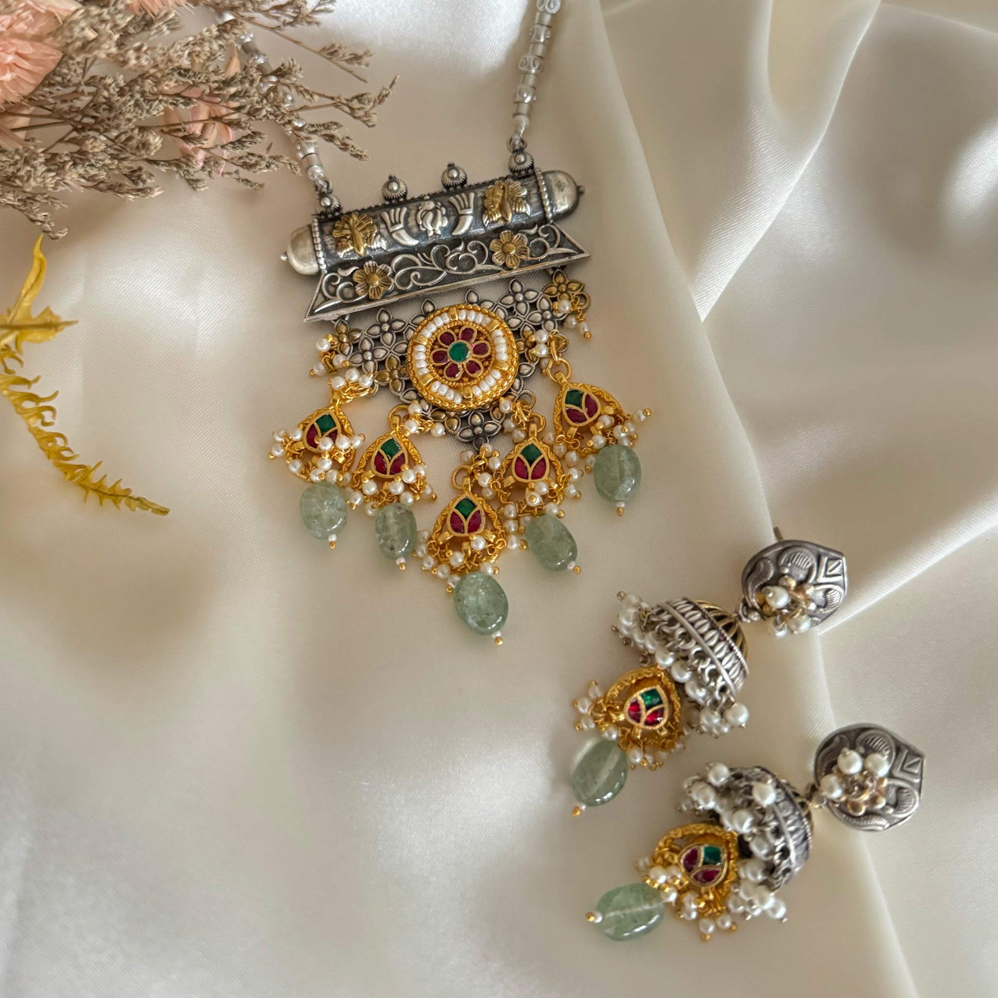 - Paachi kundan and silver finish.