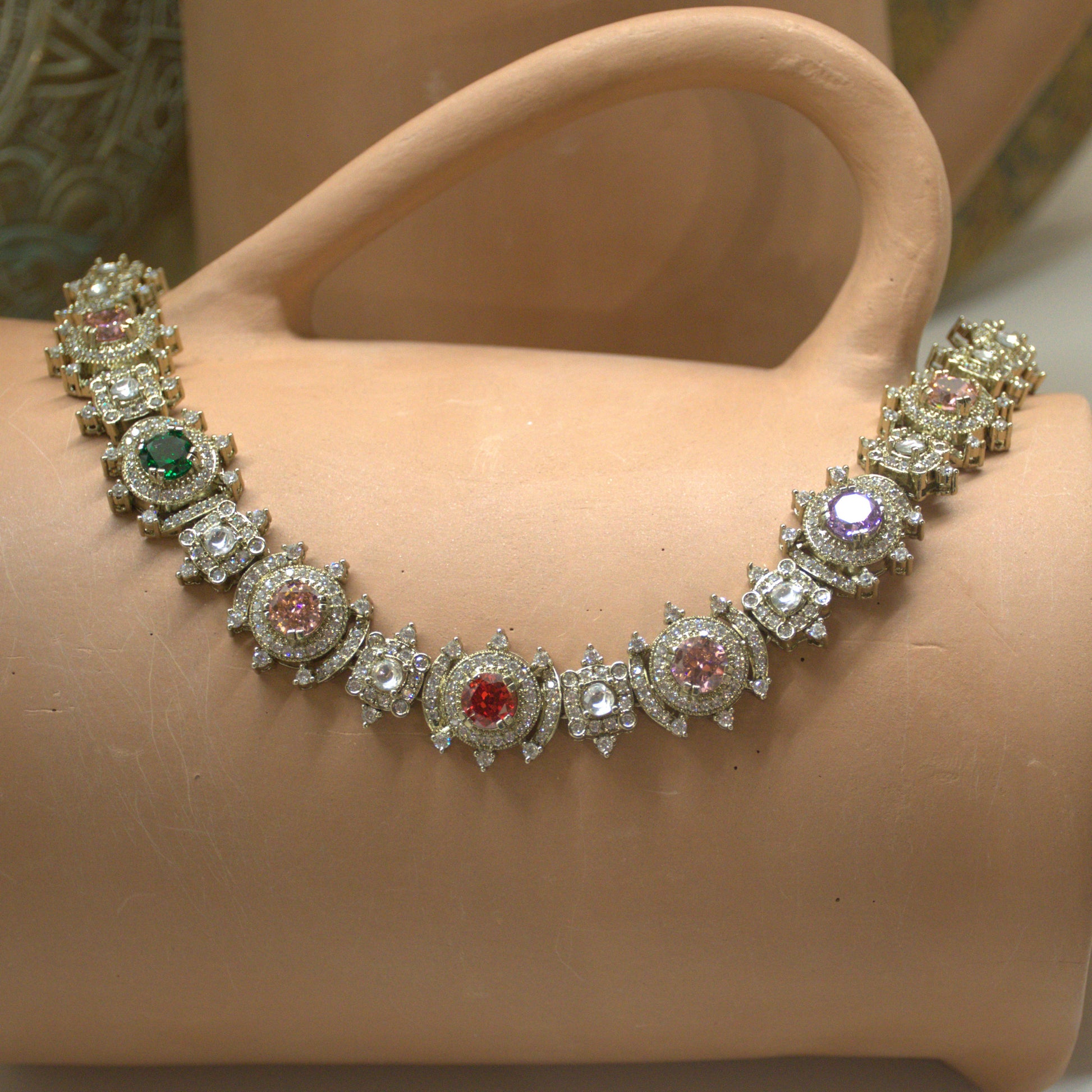 - American diamond, semi-precious stones, gold foil all around with antique silver finish.